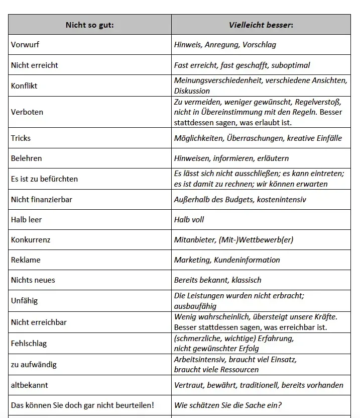 Positiv formulierte Kritik wird dagegen eher angenommen – es entsteht eine partnerschaftliche Atmosphäre und der Kritisierte fühlt sich nicht persönlich angegriffen.